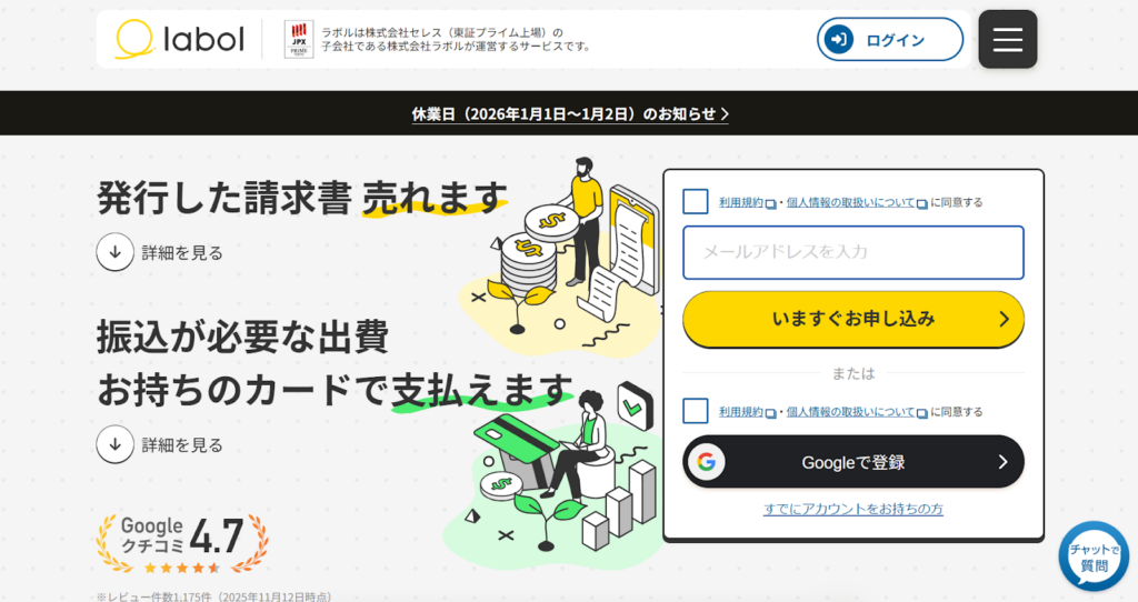 「ラボル」は主に、フリーランス・個人事業主向けのファクタリングサービスで、開業したてでも利用できるのが魅力です。少額でも利用可能で、1万円~必要な金額のみ調達できます。