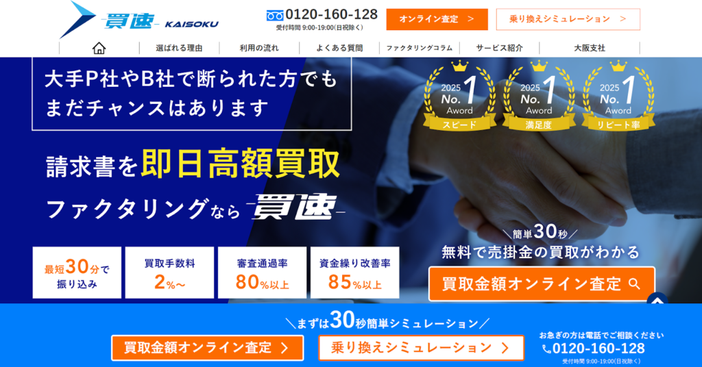 「買速」は、創業10年以上の実績を持ち、その名の通り、スピード買取を強みとしているファクタリング会社です。