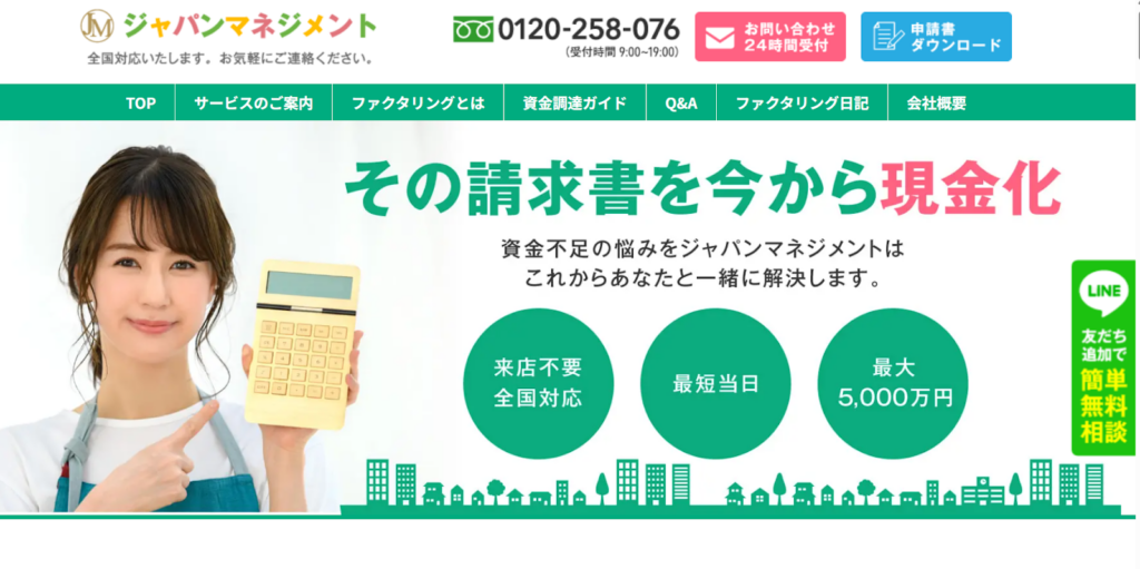 「ジャパンマネジメント」は、福岡と東京に拠点を持ち、全国対応可能な、ファクタリングサービスです。 最大5,000万円までの買取に対応し、最短即日でスピーディーに資金調達ができます。
